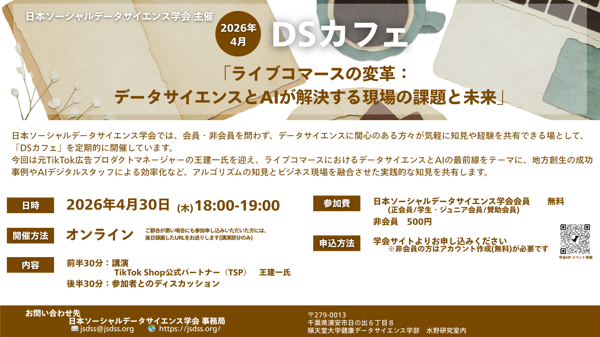今回のDSカフェでは、元TikTok広告プロダクトマネージャーの王建一氏をお迎えし、「ライブコマースの変革: データサイエンスとAIが解決する現場の課題と未来」をテーマにご講演いただきます 。ライブコマースにおけるデータサイエンスとAIの最前線をテーマに、地方創生の成功事例やAIデジタルスタッフによる効率化など、アルゴリズムの知見とビジネス現場を融合させた実践的な知見を共有します 。データサイエンスや最新のAI活用、ライブコマースのビジネス展開にご関心のある方は、ぜひご参加ください。